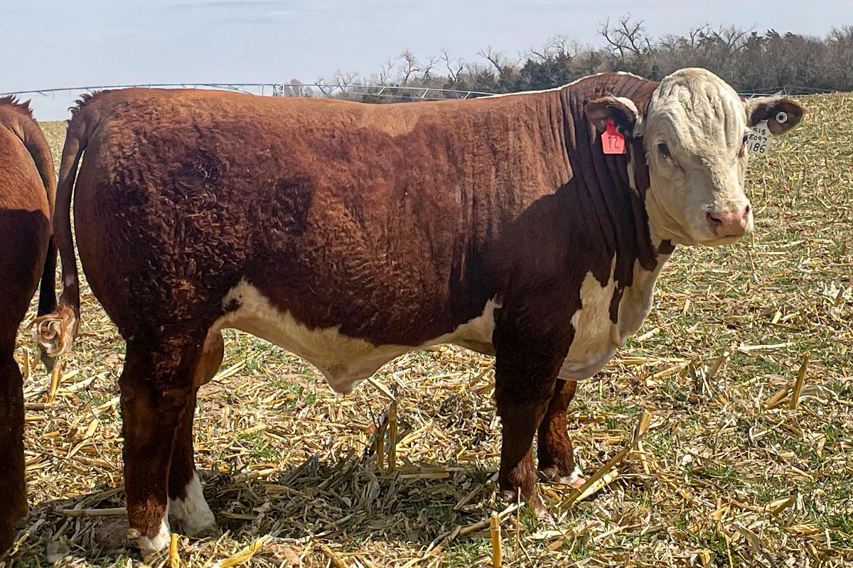 Homozygous Polled. A volume bull with a big spring of rib and rear quarter. Pigmented. Should add size to his offspring. Very calm disposition.